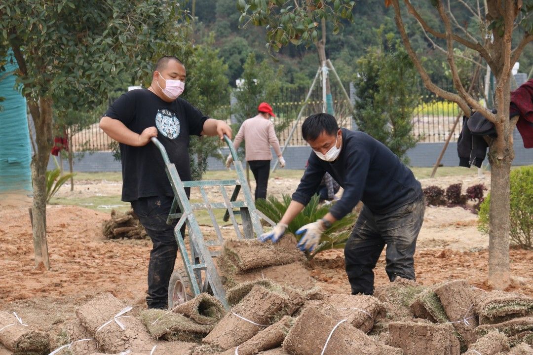 3月16日,在通城縣實(shí)驗(yàn)學(xué)校,記者看到工作人員正在分頭忙碌著,有的運(yùn)送草皮,有的種植樹苗,一派緊張有序、如火如荼的施工場(chǎng)景。